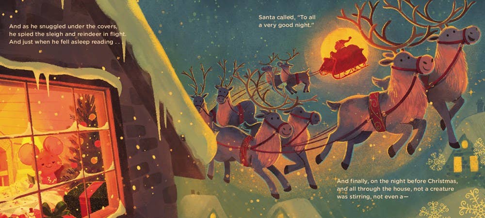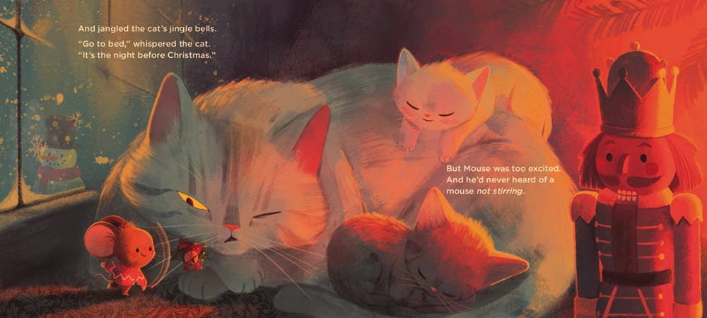 Twas the night before Christmas, when all through the house, not a creature was stirring, not even a— MOUSE! He had never heard of a mouse not stirring. It was the most glorious night of the year! So he stirred. Squeaked! Eeked! Anything but sleep.
