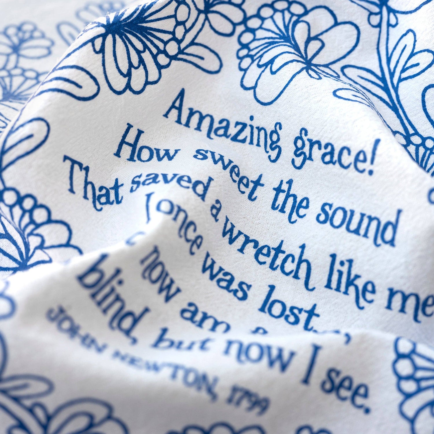 Brighten your home with jubilant song and beautiful illustrations. The Amazing Grace hymn tea towel is printed in blue and features lyrics from the beloved hymn. Made of 100% cotton, these flour sack tea towels easily and cost-effectively replace disposable paper towels with high absorbency and durability. Or use as curtains or a wall display. Generously sized, lint free, and made to last a lifetime. Perfect for gift giving. Illustrated by Kate Whitley.