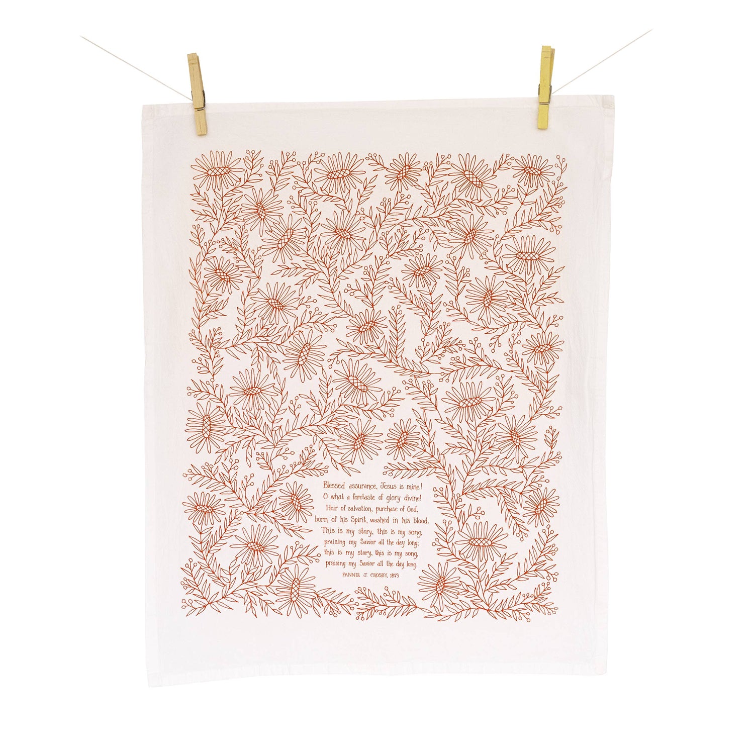 Our hymn tea towels brighten your home with color and song. The Blessed Assurance hymn tea towel is printed in rust and features lyrics from the hymn accented by intricate floral design. Made of 100% cotton, these flour sack tea towels easily and cost-effectively replace disposable paper towels with high absorbency and durability. Generously sized, lint free, and made to last a lifetime. Illustrated by Kate Whitley.