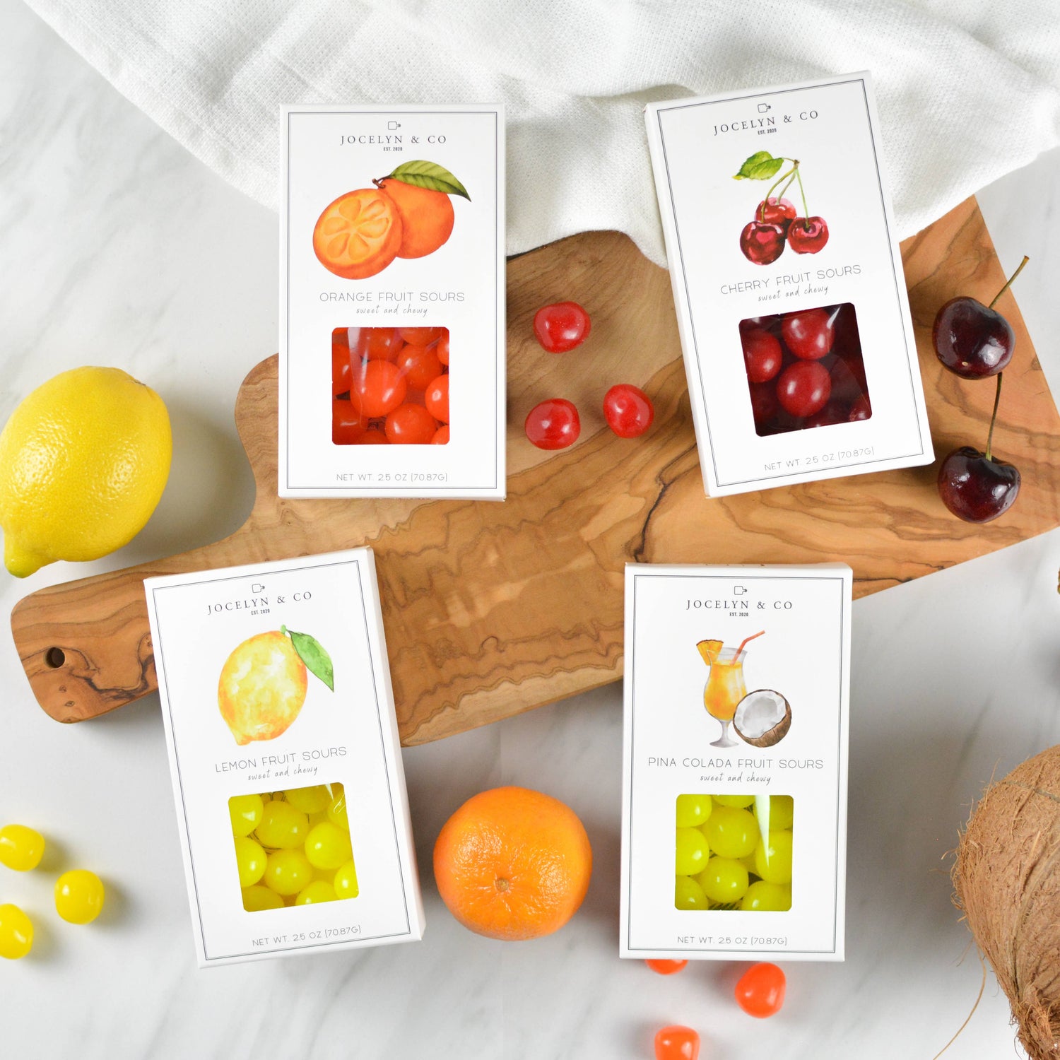 Classic and timeless candy in our signature luxe packaging. Cherry sours have been around for over a 100 years and continue to be a popular candy that plays with a combination of flavor and texture. The cherry sours are both sweet & sour, and both hard and chewy. Packaged in our signature luxe packaging design. Also available in orange, and lemon.