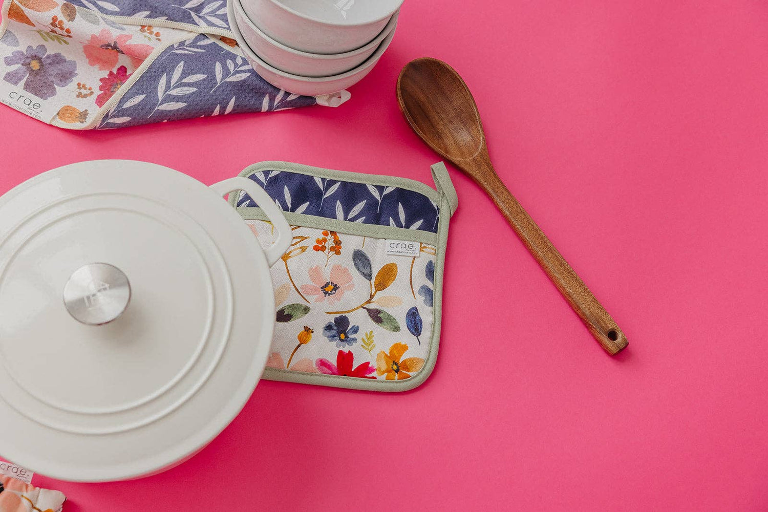Complete the look with this matching pot pad — the perfect partner for your oven mitt! Crafted from soft cotton with the same fun mix of prints, it’s ideal for protecting your hands, counters, and tabletops from hot dishes. The thick, heat-resistant design offers both comfort and durability, while the hanging loop makes it easy to store or show off. Cute, cozy, and kitchen-ready — a small but mighty touch of charm for every meal! Turn up the heat and get crae.