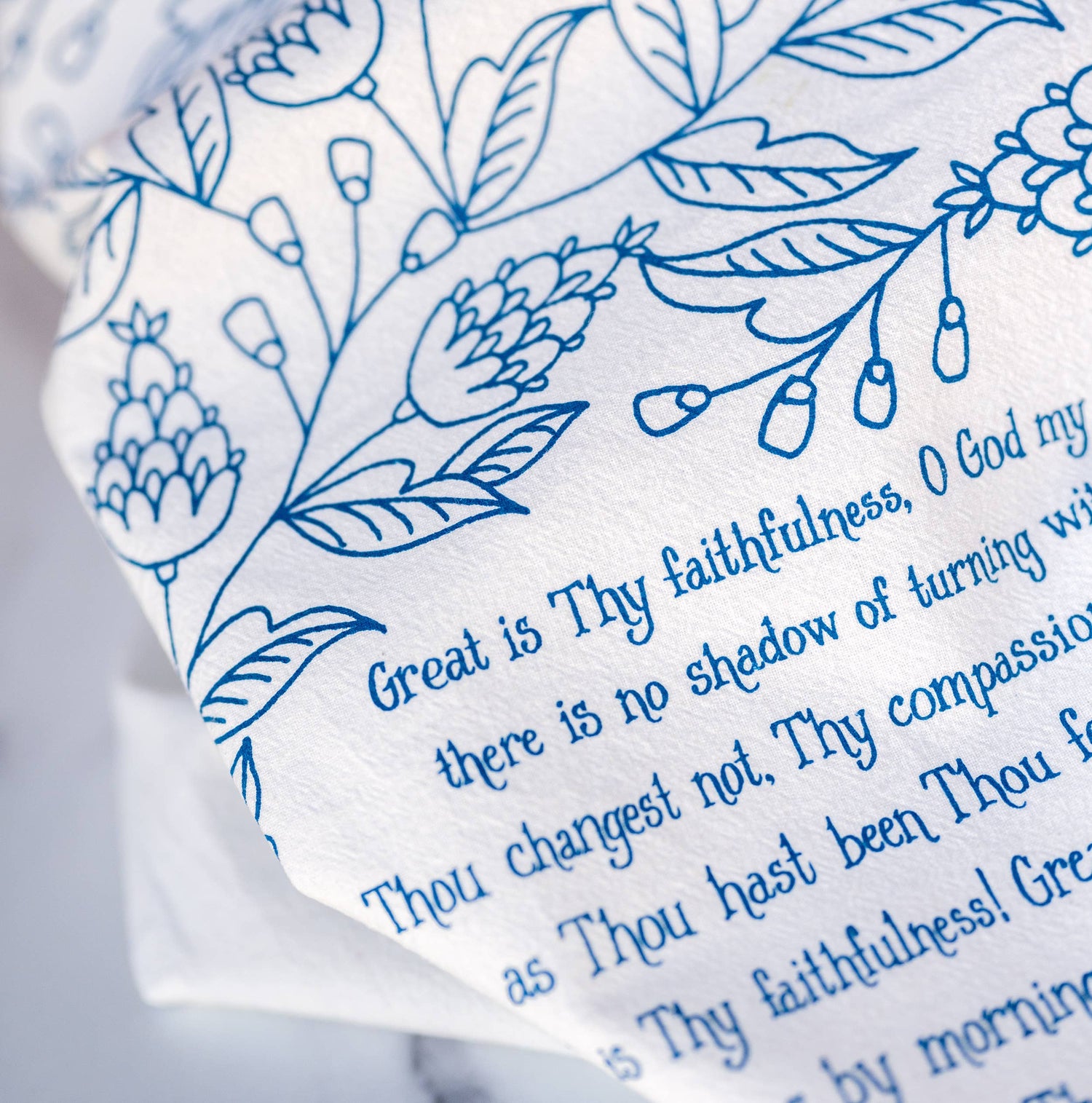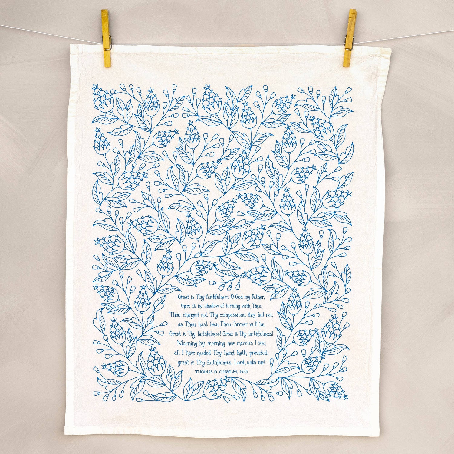 Brighten your home with color and song. The "Great Is Thy Faithfulness" hymn tea towel is printed in cerulean blue and features lyrics from the hymn. Made of 100% cotton, these flour sack tea towels easily and cost-effectively replace disposable paper towels with high absorbency and durability. Or use as curtains or a wall display. Generously sized, lint free, and made to last a lifetime. Perfect for gift giving. Illustrated by Kate Whitley.