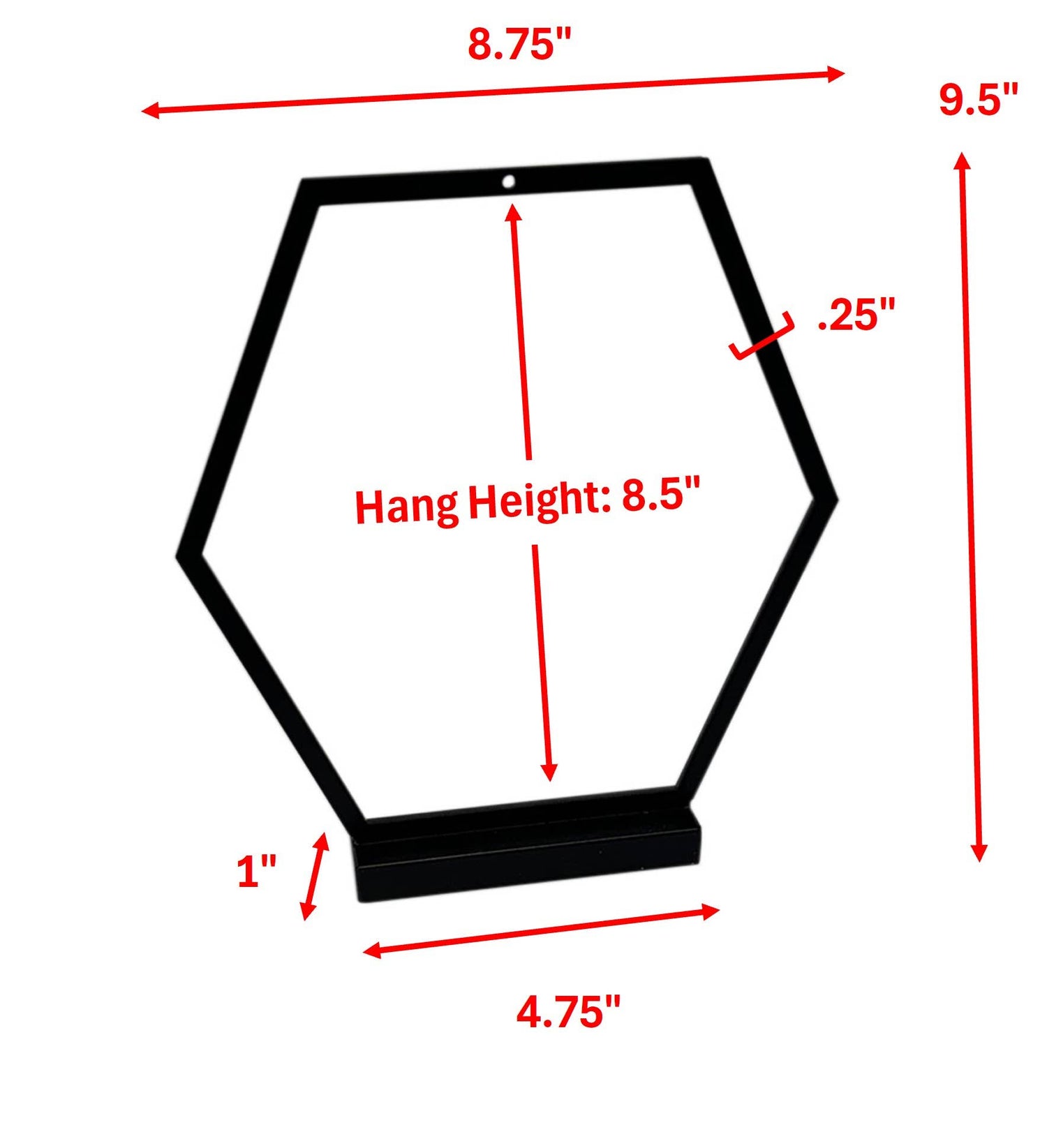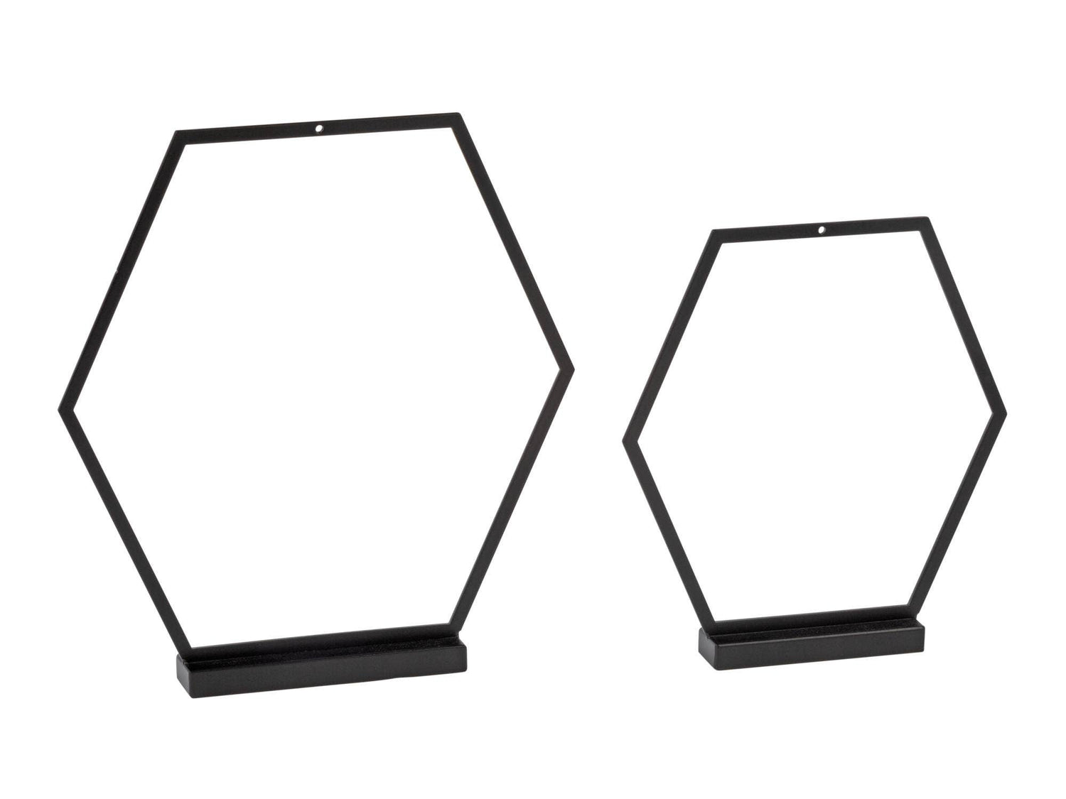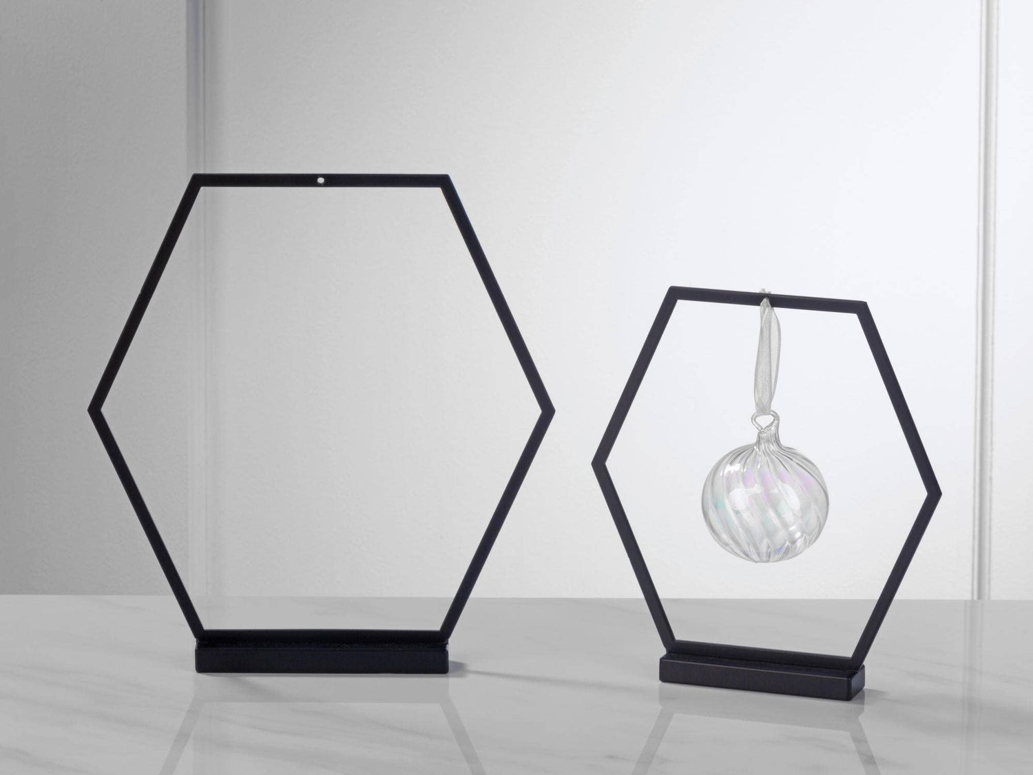 Showcase your most cherished ornaments or decorative eggs while adding an elegant touch to the home with these beautiful sturdy ornament stands. These ornament stands feature a simple hexagon design and black powder coated finish which makes a beautiful display for all colors and types of decorative ornaments or eggs. It features a sturdy weighted heavy-duty base and has a small hanging hole, which can be used for a hook. If you don't want to use a hook simply tie a ribbon on the top of the display to hang your ornament. Comes in two sizes - short or tall.