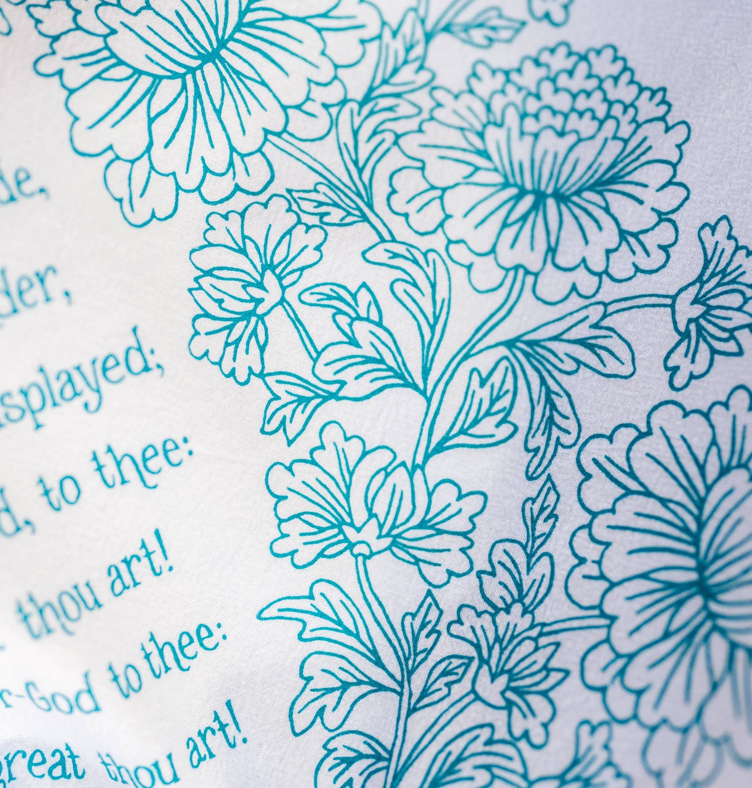 Brighten your home with color and song. The "How Great Thou Art" hymn tea towel is printed in aqua and features lyrics from the hymn. Made of 100% cotton, these flour sack tea towels easily and cost-effectively replace disposable paper towels with high absorbency and durability. Or use as curtains or a wall display. Generously sized, lint free, and made to last a lifetime. Perfect for gift giving. Illustrated by Kate Whitley.