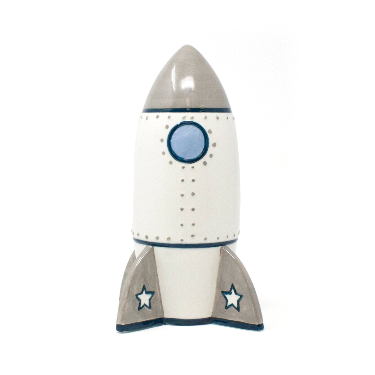 The Roger Rocket Bank is a charming piggy bank designed to inspire savings with a playful rocket ship motif. Made from durable dolomite ceramic, this bank features a sleek white body accented with a gray pointed top and gray fins, each decorated with a white star outlined in blue. The blue circular window detail on the front enhances its space-themed design.