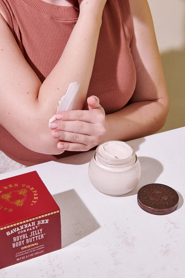 Our Original Royal Jelly Body Butter glides on with the sweet smell of wild blackberries, velvety vanilla, and hints of gardenia for the ultimate skin-quenching treat. Rose clay lends a light pink hue and removes impurities, while deep moisture and nourishing antioxidants come from royal jelly harvested from the queen’s own chamber.