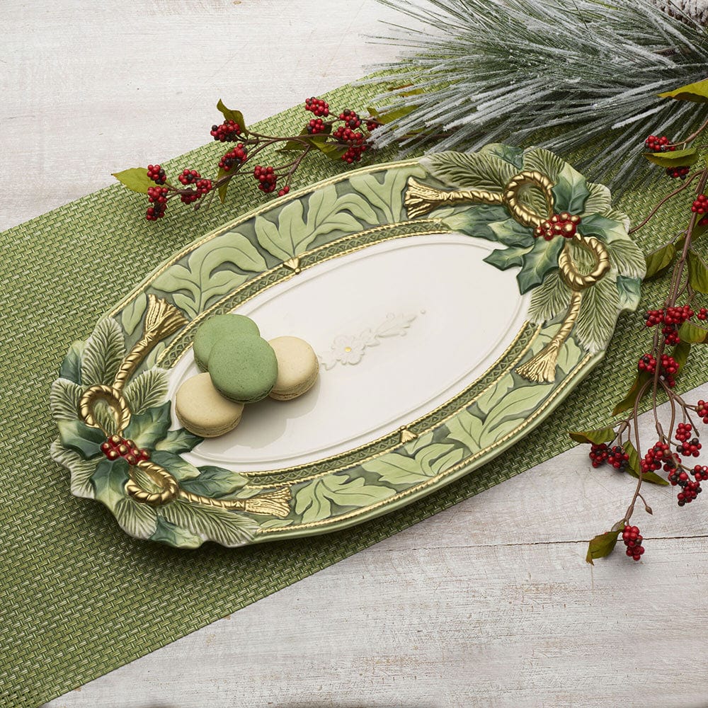 Holiday Home warms the heart with its classic design use of rich reds and pine greens. Items throughout the collection have beautifully embossed damask patterns complimented with holly leaves, pine needles and decorative gold detailing. This elegant hand painted ceramic holiday server is perfect for chips and dip, or a healthier option of fruit and veggies. Packaged in a gift box, perfect for gifting.