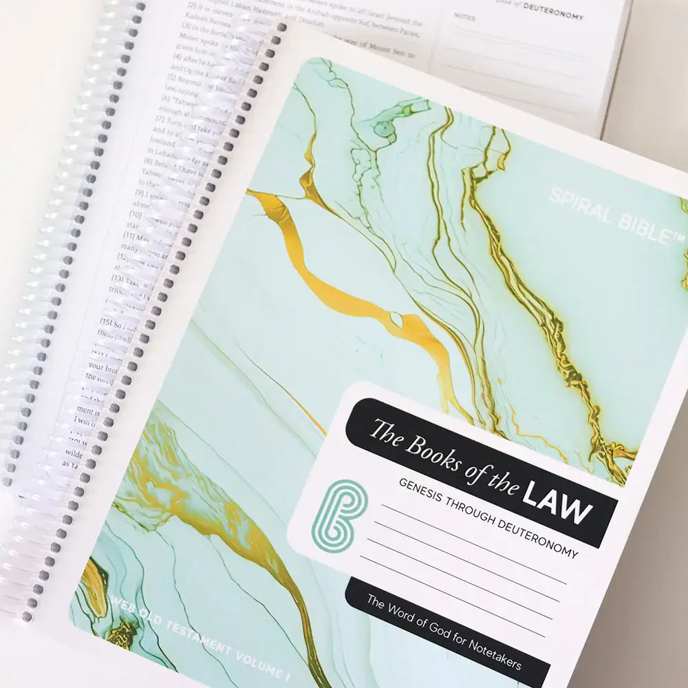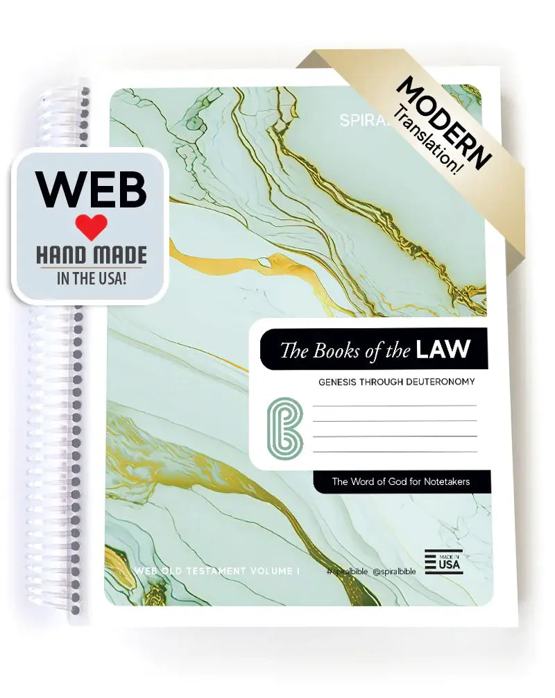 The Old Testament Books of the Law, Genesis through Deuteronomy, is now available in the World English Bible (WEB)! The first of the Old Testament four volume series is now a spiral bound Bible notebook. The pages lay completely flat so you can read, study, take notes, color, or draw.