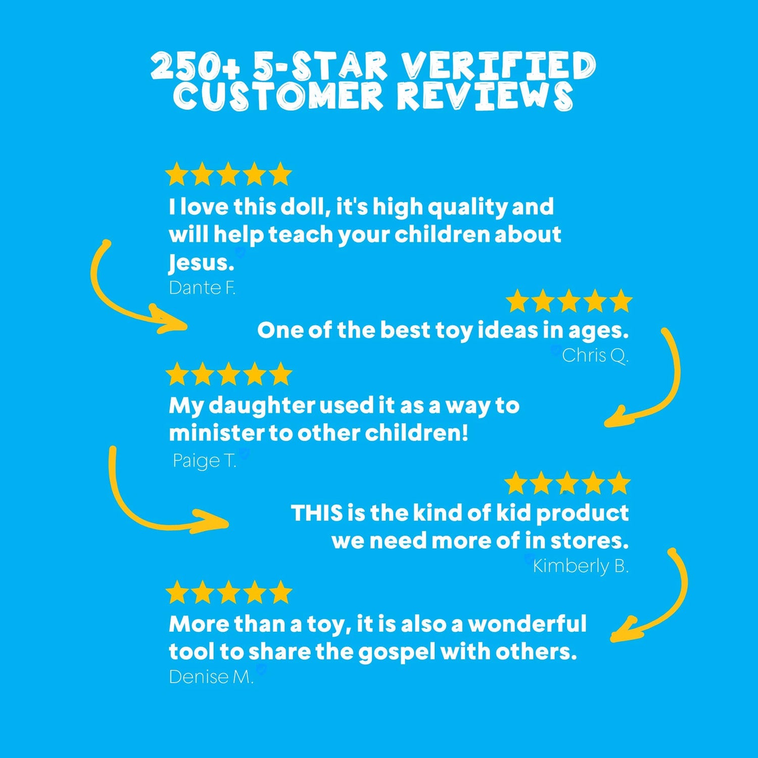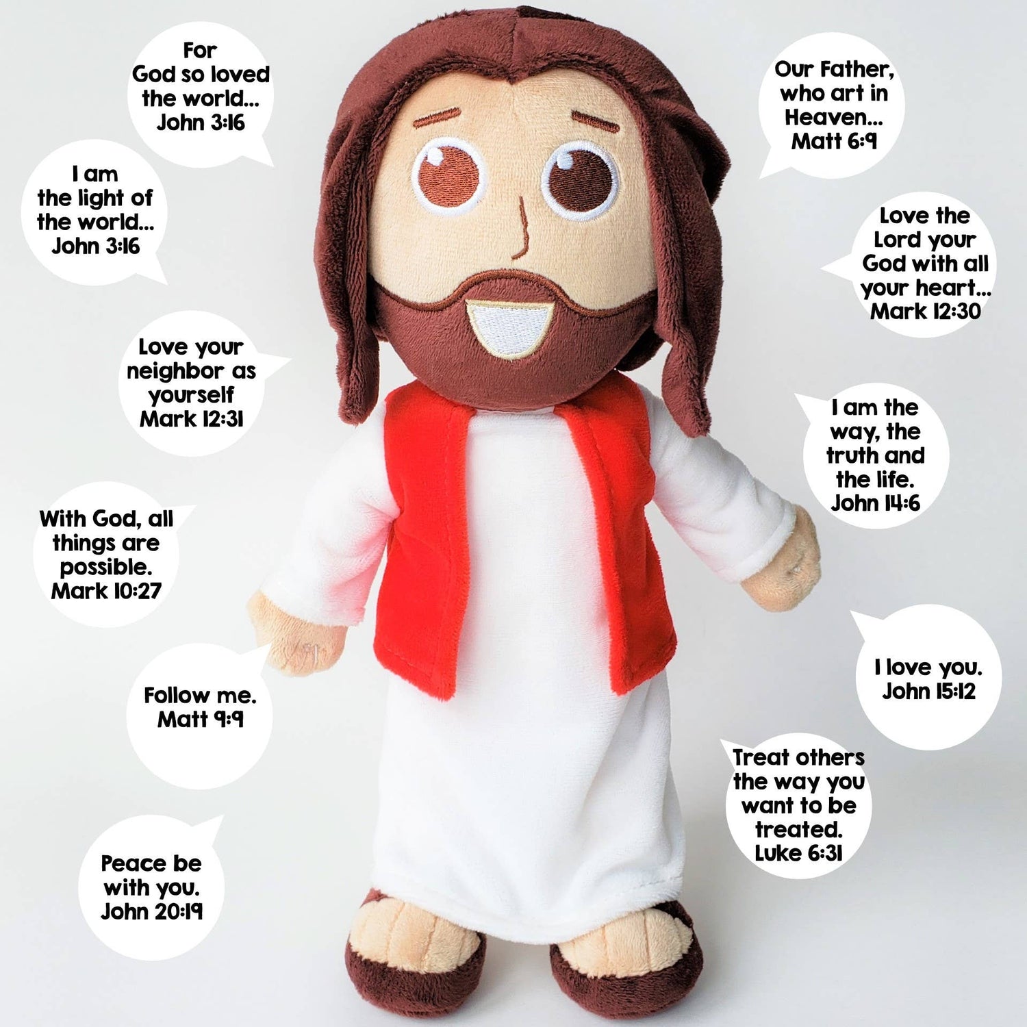 The Talking Jesus Doll is a beautiful 12" plush Jesus that speaks 10 phrases that Jesus said in the Bible. Jesus welcomes children with his outstretched arms, warm smile and a super-soft body. Children LOVE to squeeze his hand to make him talk. Parents and grandparents LOVE that their little ones are learning Jesus' important teachings from the Bible. Perfect for Christmas or for Christian Easter baskets. More than a toy, it opens up kids to Christ. Teach your kids before the World does.