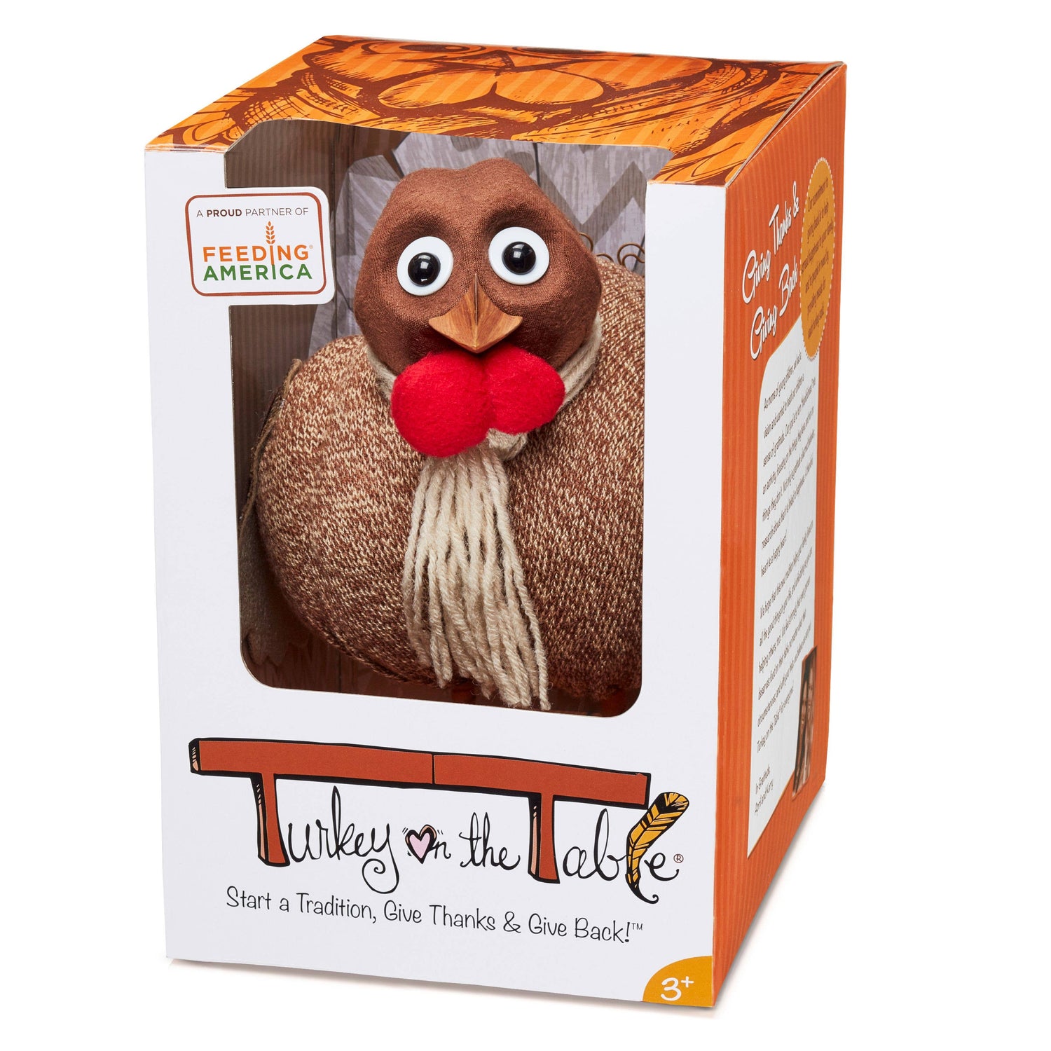 Each Turkey on the Table® kit includes an adorable knit turkey, 13 double-sided, customizable feathers with marker, and a heartwarming book.