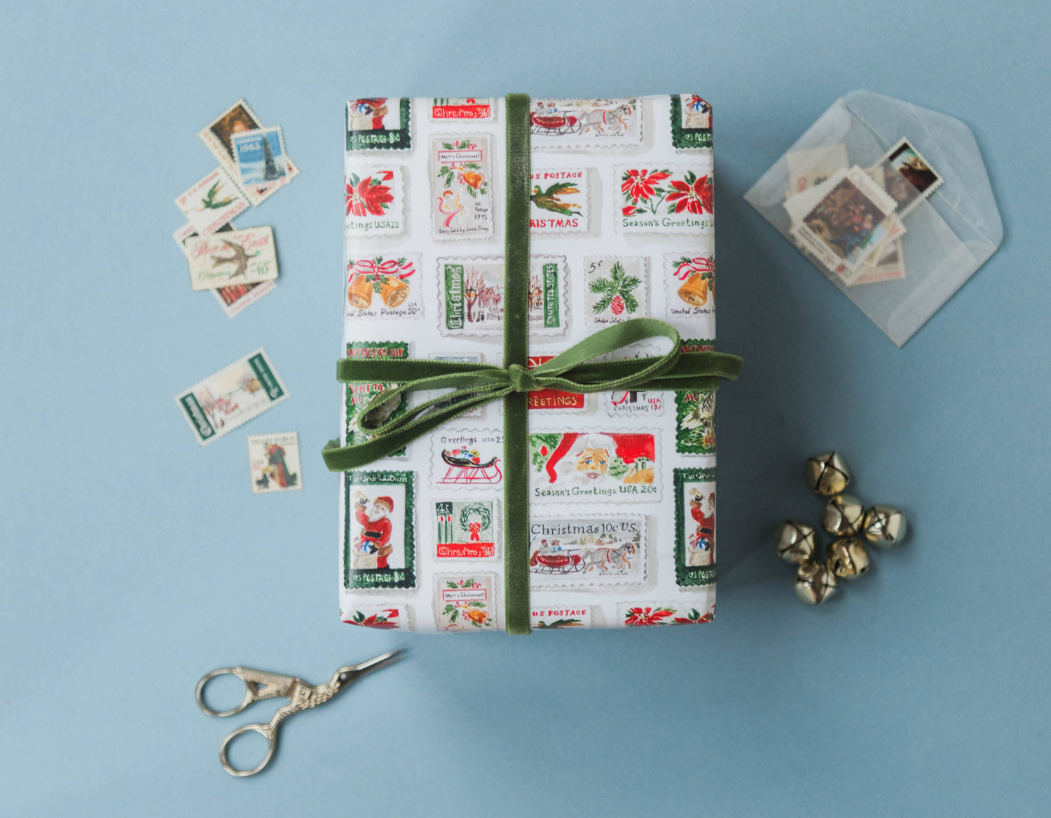 A festive pattern of vintage stamps makes for the perfect holiday gift wrap.