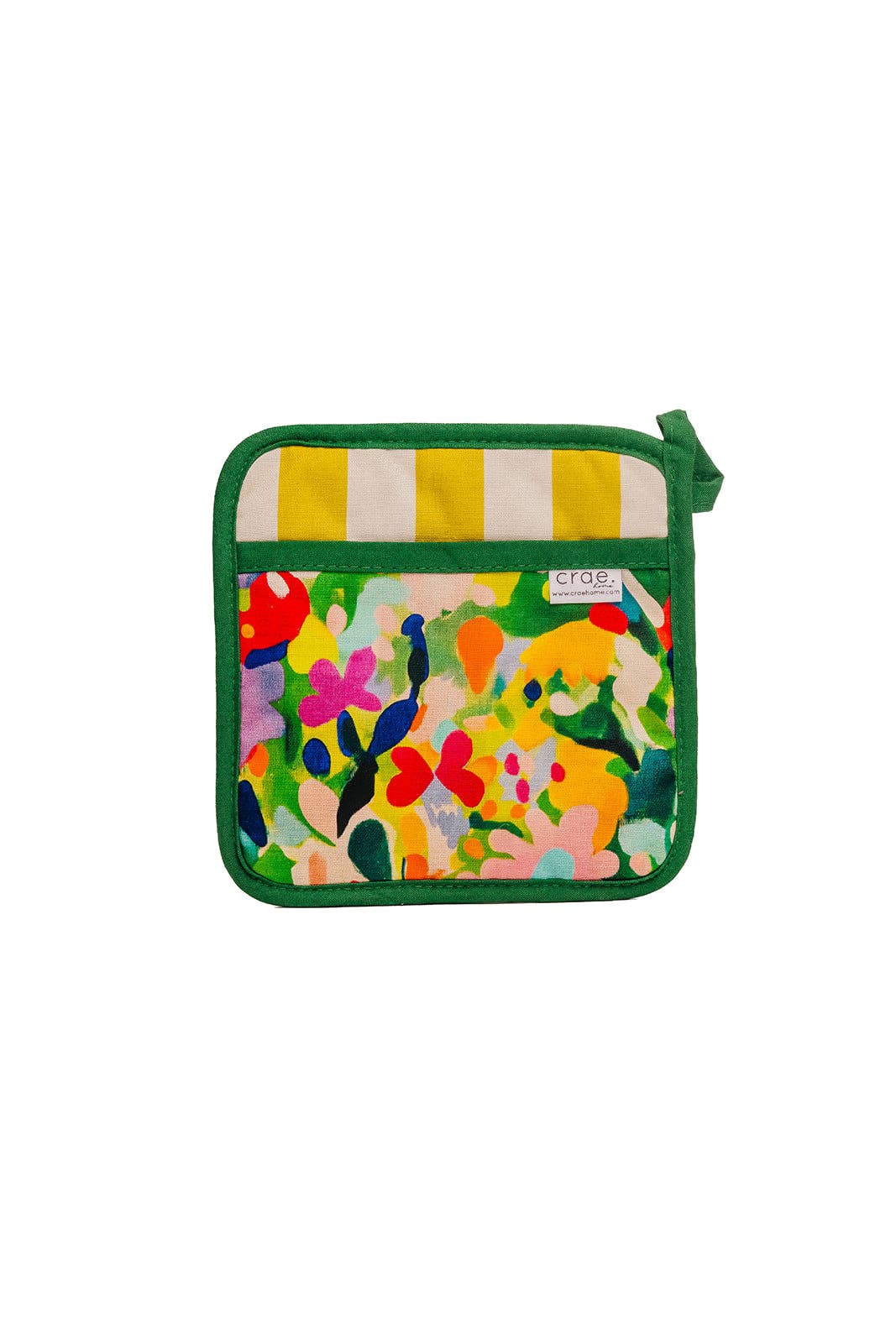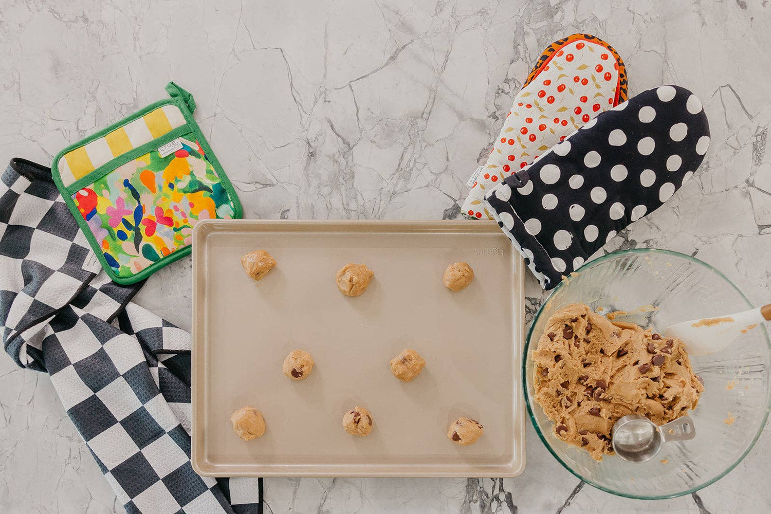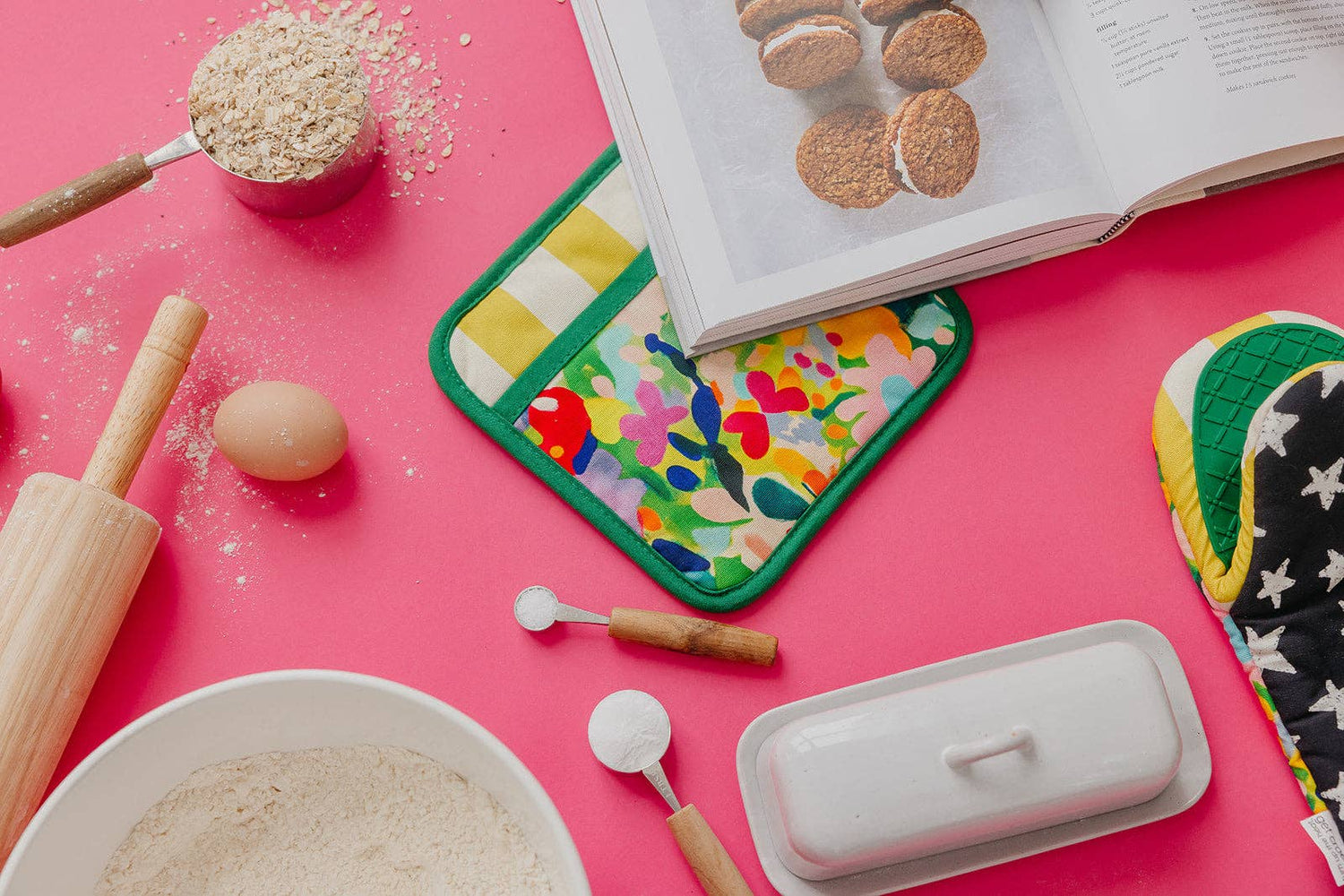Complete the look with this matching pot pad — the perfect partner for your oven mitt! Crafted from soft cotton with the same fun mix of prints, it’s ideal for protecting your hands, counters, and tabletops from hot dishes. The thick, heat-resistant design offers both comfort and durability, while the hanging loop makes it easy to store or show off. Cute, cozy, and kitchen-ready — a small but mighty touch of charm for every meal! Turn up the heat and get crae.
