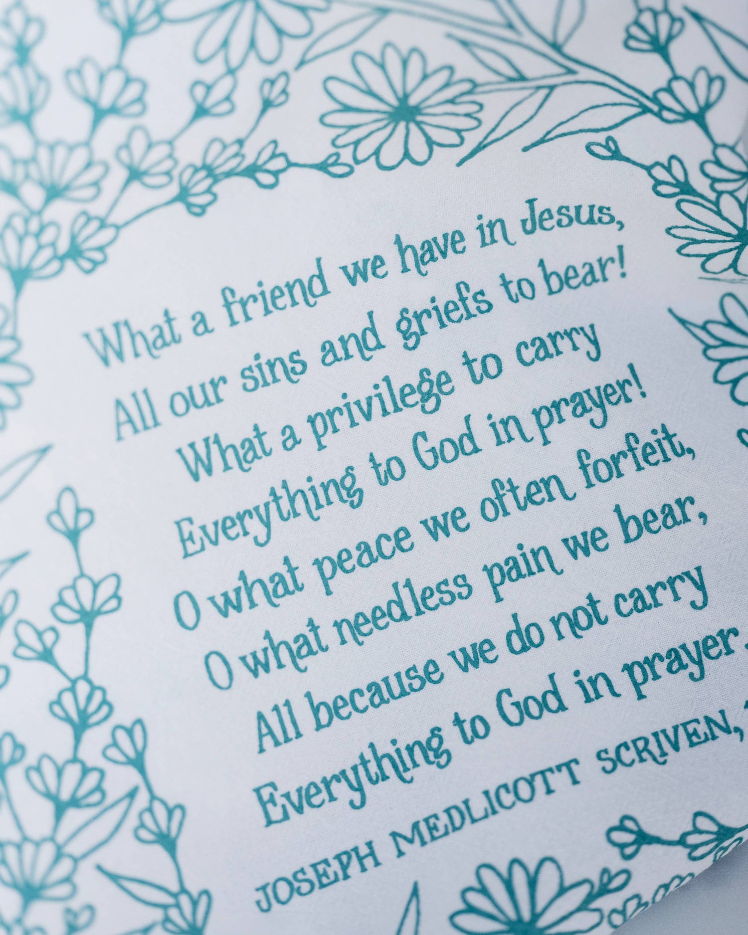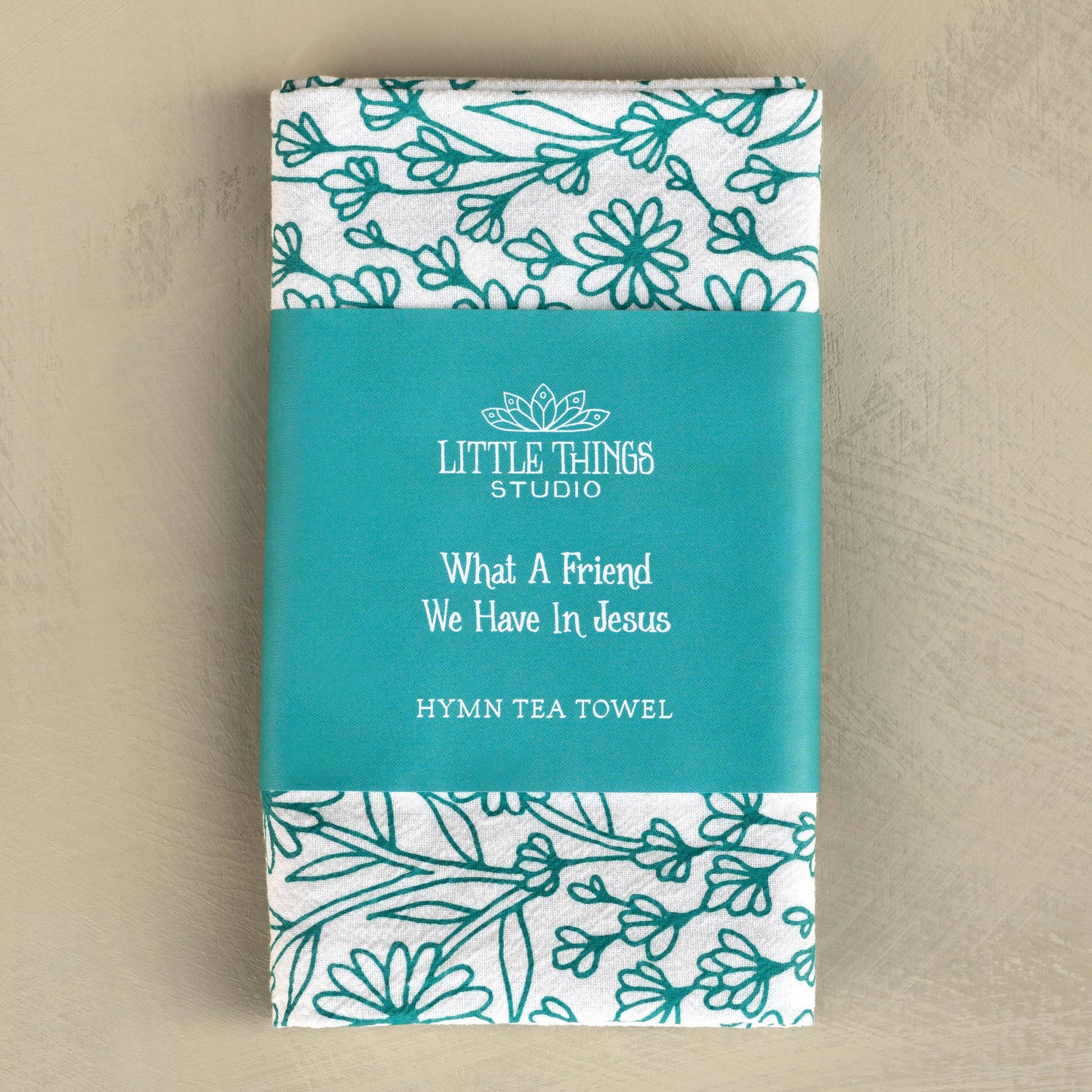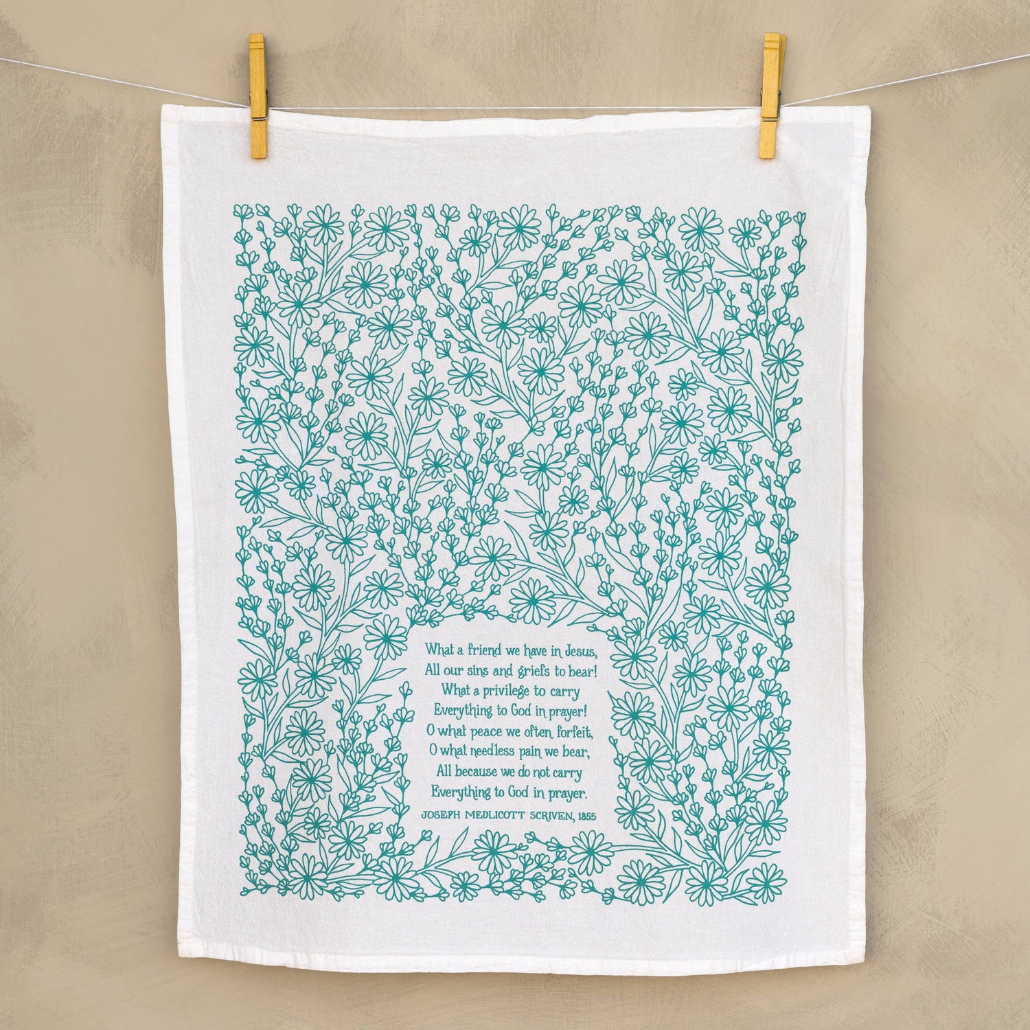 Our hymn tea towels brighten your home with color and song. The What A Friend We Have in Jesus hymn tea towel is printed in turquoise and features lyrics from the hymn accented by intricate floral design. Made of 100% cotton, these flour sack tea towels easily and cost-effectively replace disposable paper towels with high absorbency and durability. Generously sized, lint free, and made to last a lifetime. Illustrated by Kate Whitley.